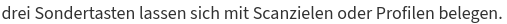 - Tasten für direktes Drucken an voreingestellte Ziele mit entsprechenden Profilen ohne das Menü benutzen zu müssen -> 1 Klick