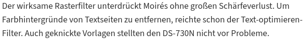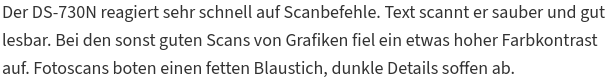 Sicherlich könnte das Ergebnis (vielleicht sogar deutlich) durch tuning der Einstellungen verbessert werden. Ein DOKUMENTEN-Scanner sollte in der Standardeinstellung bei Textseiten aber kein schlechteres Ergebnis liefern als eine 2 EUR App auf dem Handy.